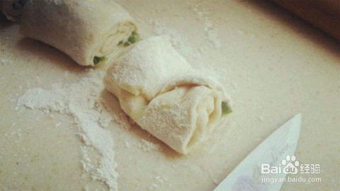 5. 制作花卷:将小面团擀成圆饼状,用筷子在圆饼上扎几个孔,然后从一边卷起,卷成花卷形状。